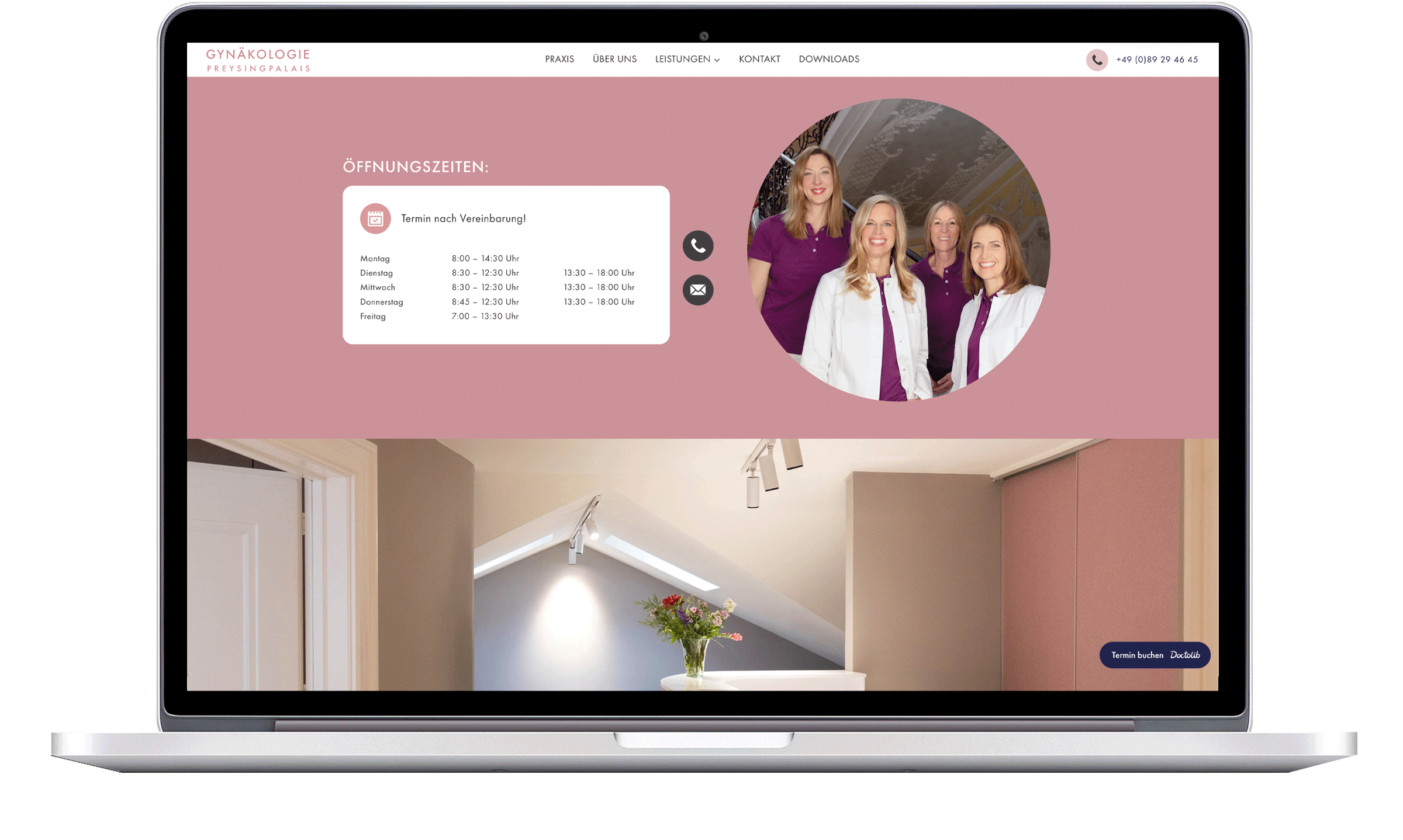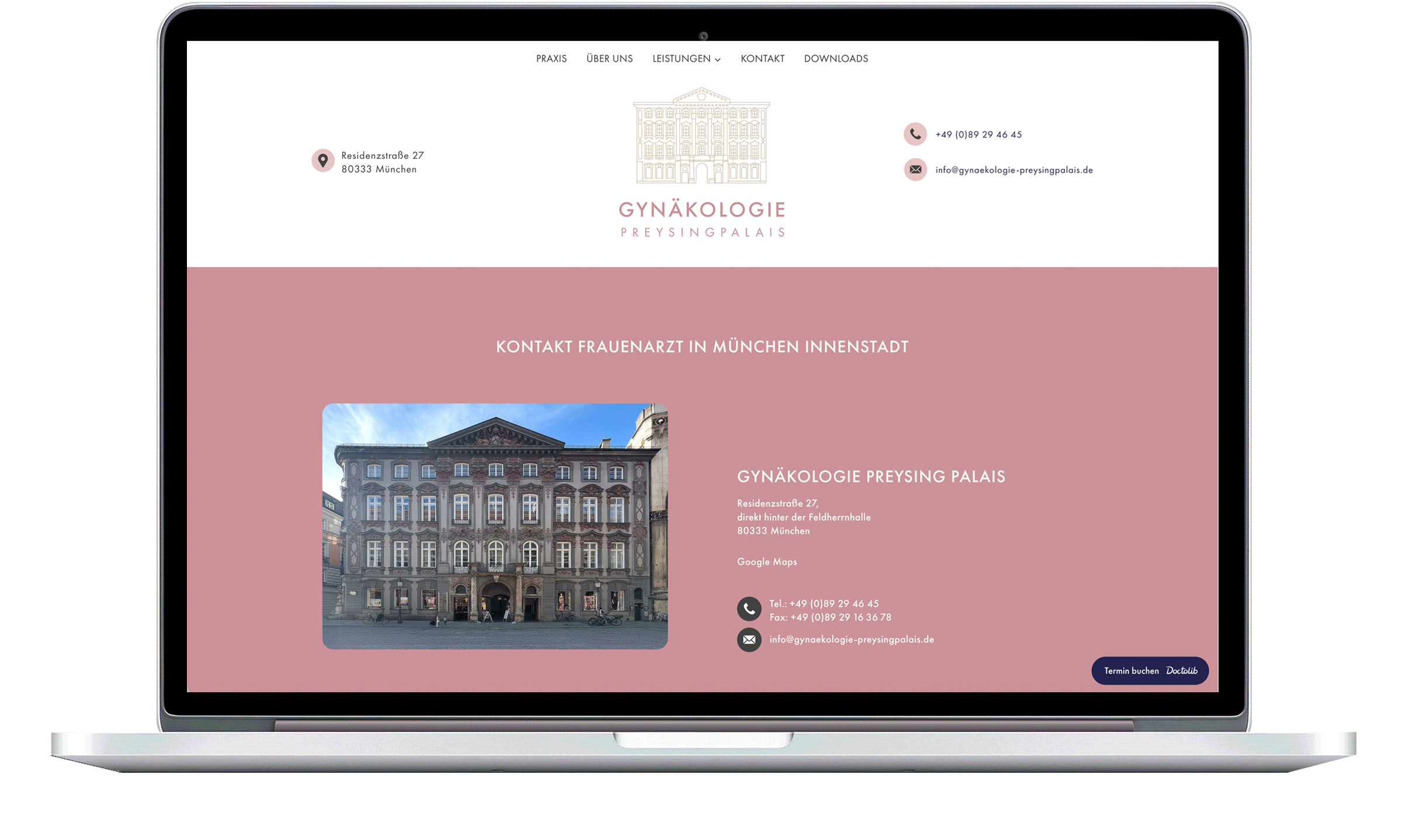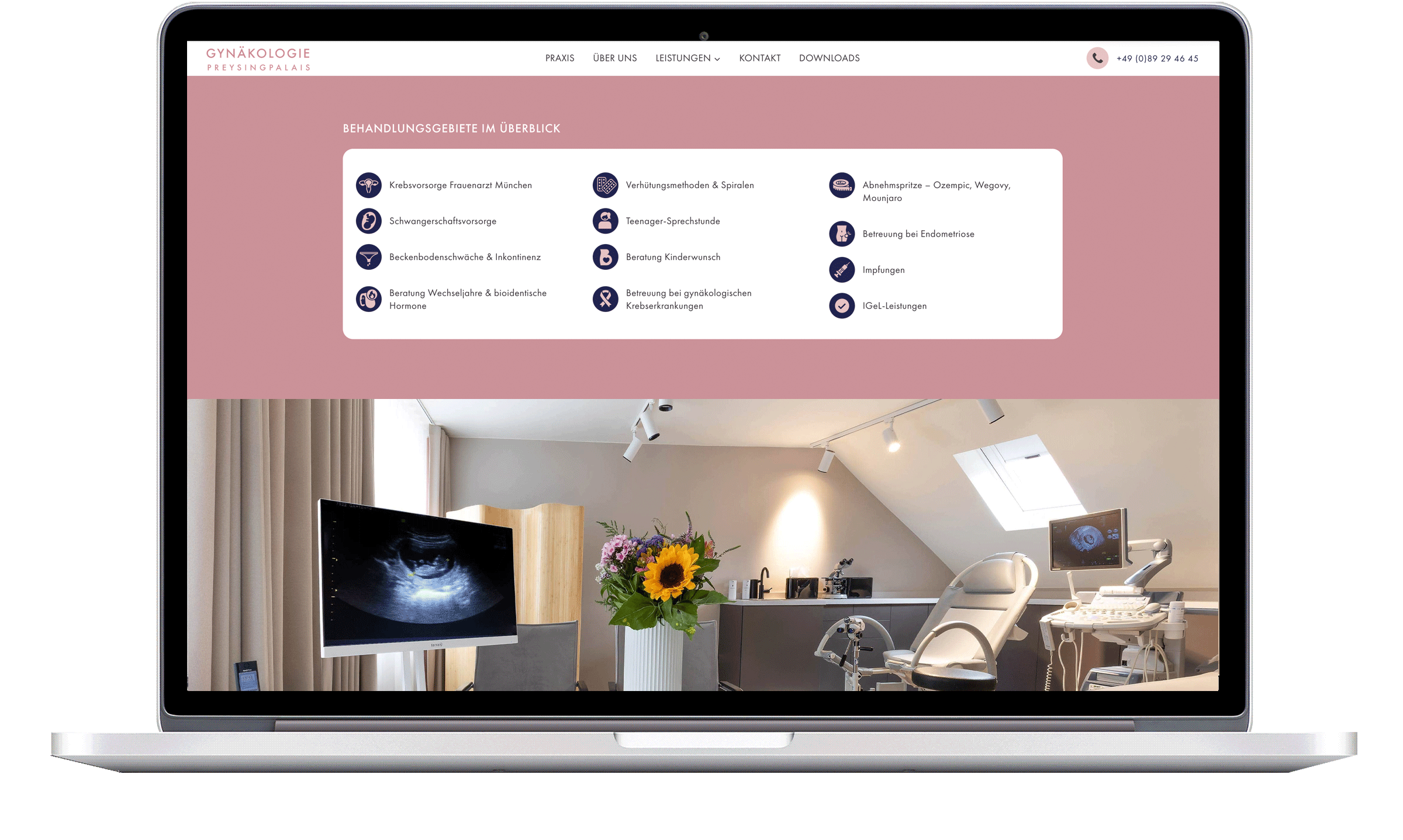 Komplette Betreuung von Logoentwicklung über Praxisschild, Google Profil, Portrait- und Praxisfotos, Website, Plakate, Flyer und mehr. frauenarzt-in-münchen.de